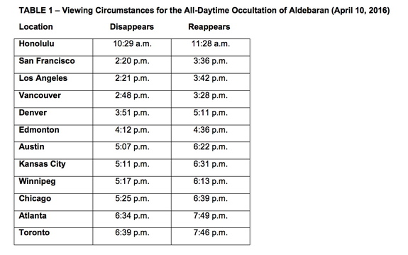 Table 1 provides a listing for a dozen selected cities in the United States and Canada and the times when Aldebaran will disappear, and later reappear, from behind the moon. All times are in local daylight time, except for Honolulu. (Hawaii does not observe daylight saving time.)