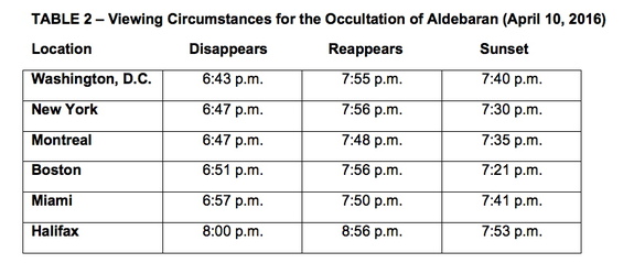 Table 2 provides listings for six selected cities in the northeastern United States and eastern Canada, and the times when Aldebaran will disappear and later reappear (after sunset) from behind the moon. The local time of sunset is included. All times are in local daylight time.