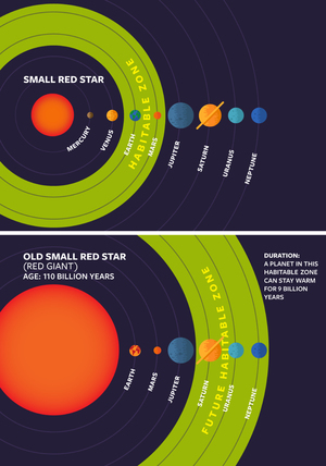 This infographic illustrates how the habitable zone of a small red star will move out when the star expands into a red giant. Small stars remain in this phase of life longer than large stars, so planets in the “new” habitable zone can remain there for billions of years.
