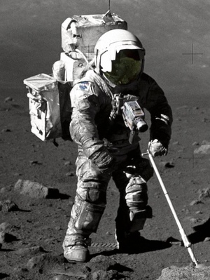 Astronaut-geologist Harrison Schmitt on an Apollo 17 moonwalk in 1972. The cohesive nature of the lunar soil is borne out by the “dirty” sheen of his space suit, later tracked into the nearby lunar module. Apollo crewmembers likened the smell of lunar regolith to spent gunpowder.