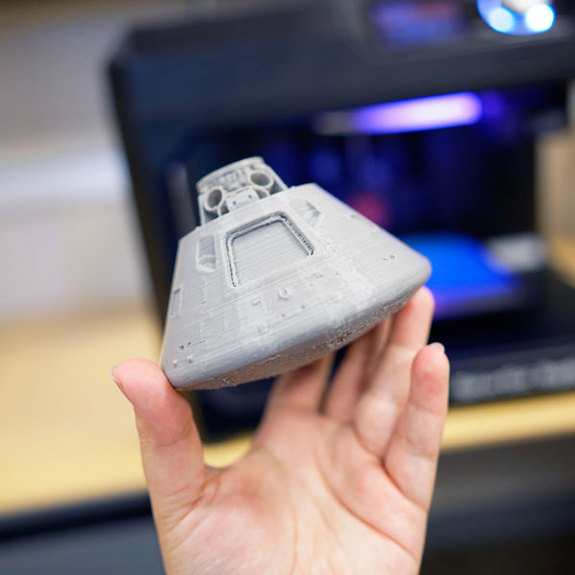 A 3D printed model of the Apollo 11 command module “Columbia” produced from a detailed scan of the spacecraft.